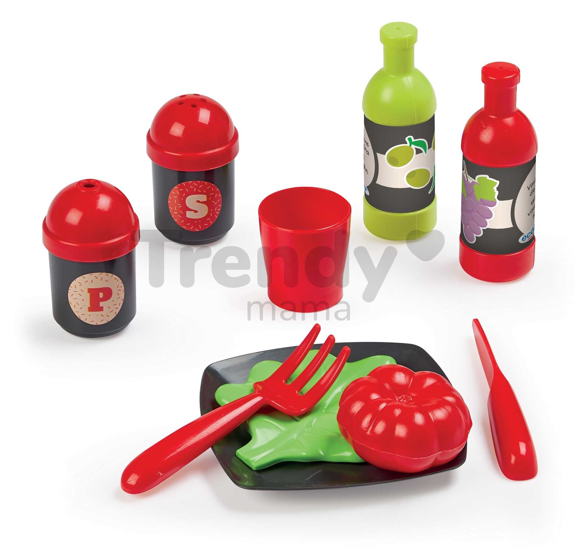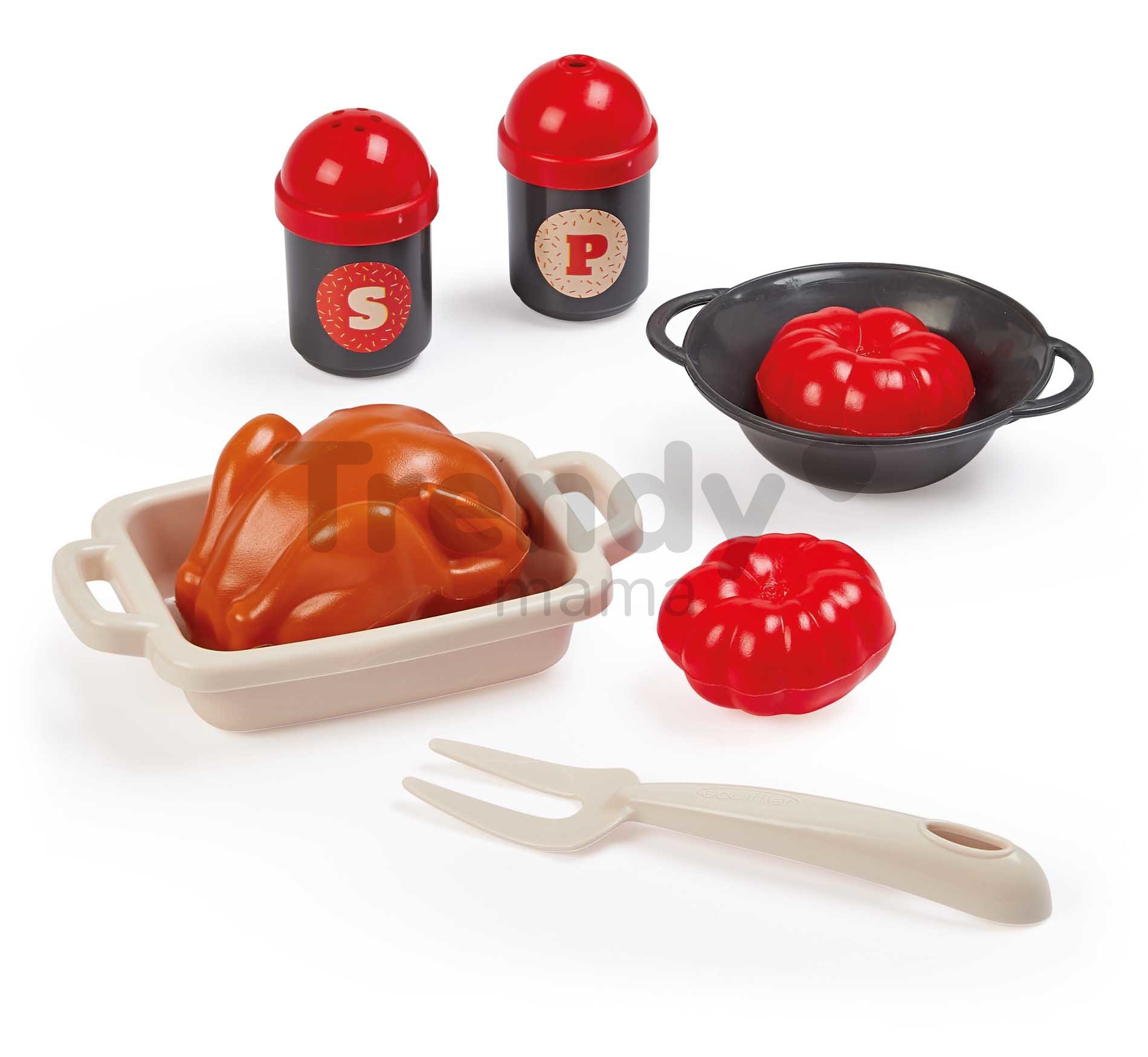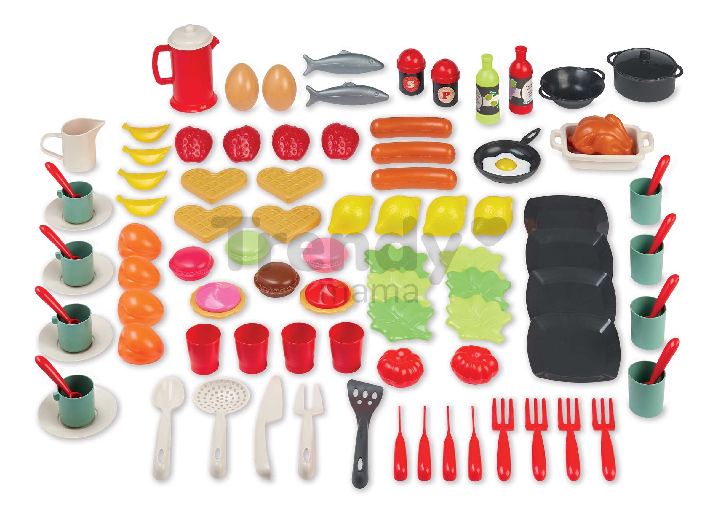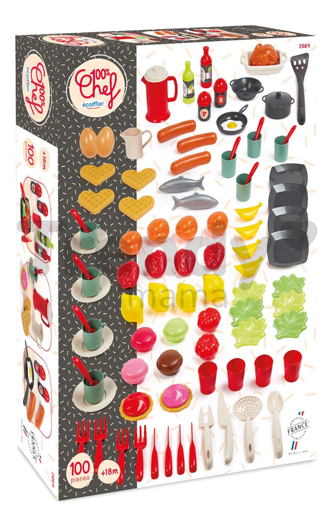 Élelmiszerek edényekkel játékkonyhába 100% Chef egy kiváló készlet kiegészítőkből gyerekek részére a francia Écoiffier vállalat műhelyéből már 18 hónapos kortól. A 100 darabos készletben megtalálhatóak különböző fazekak, grill csirke, serpenyő, virsli, halacska, tányérok, poharak, kanalak, villák, kések, csészék, konyhai eszközök, különböző gyümölcsök és zöldségek, kalácsok és számos más konyhai kiegészítő, melyek nélkülözhetetlenek a kis séfszakácsok számára. Az egyes műanyag élelmiszerek teljesen valósághű benyomást keltenek, élénk színkivitelezésük serkentően hat a fantázia és kreativitás fejlődésére. Ezekkel a hasznos kiegészítőkkel kisfiúk és kislányok még mélyebbre ássák magukat a szerepjátékokba, és nem utolsó sorban feltölthetik konyhácskájuk, büféjük, boltjuk vagy kávézójuk készletét is.