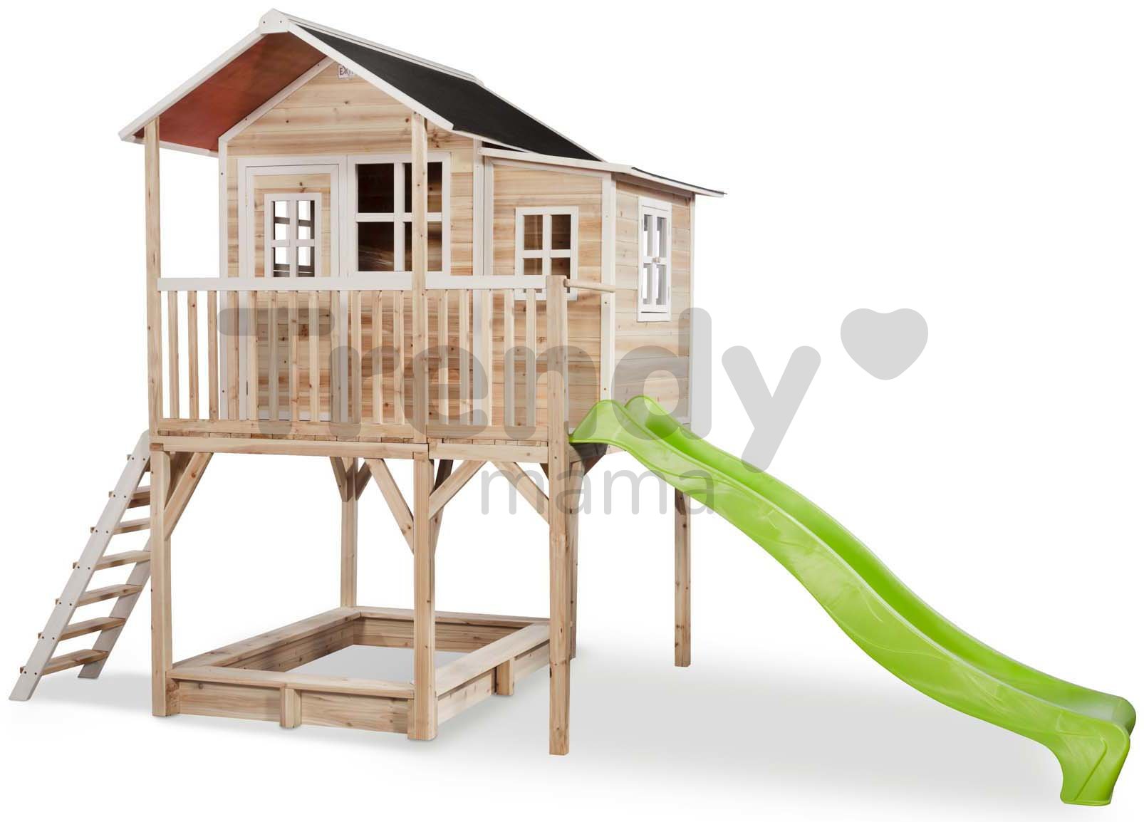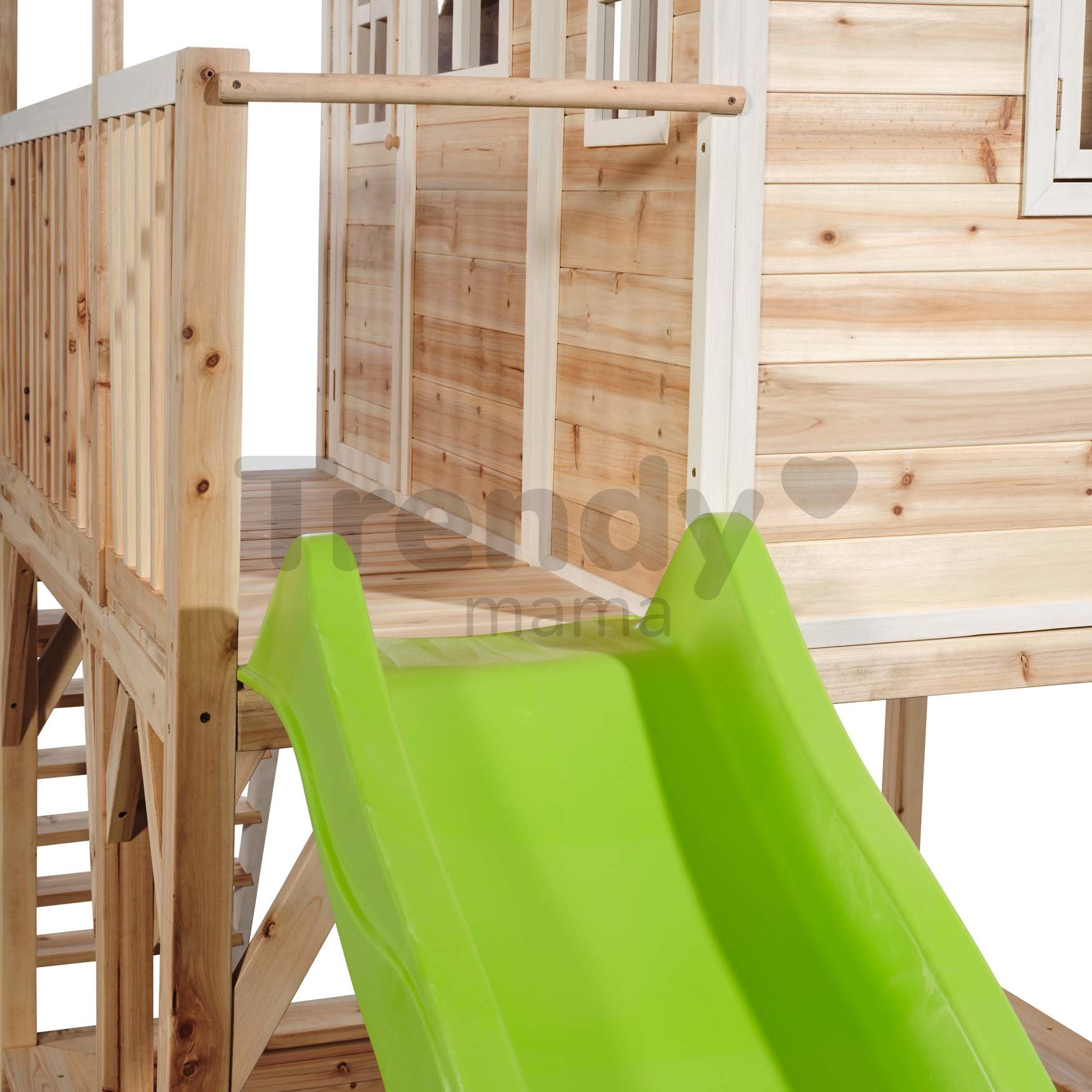 Cédrus házikó Loft 750 Natural a holland Exit Toys műhelyéből nagyszerű ajándék fiúknak és lányoknak már 3 éves kortól. Tágas pilléreken álló természetes külcsinben pompázó házikó minden kert és udvar éke lesz, skandináv megjelenése mind a gyermekek, mind a felnőttek számára vonzó lesz. A házikó összeszerelése nagyon egyszerű köszönhetően az előre előkészitett alkatrészeknek. A házikó teljes bejárati ajtaja ablakkal, 2 db nyitható ablaka, 2 klasszikus ablaka és a korlát minden gyerkőcöt és szülőt lenyűgöz már az első pillantásra. A házikóba 7 lépcsőfokkal felszerelt praktikus létrán jutnak fel a csöppségek, de garantált szórakozást szerez a 2,28 m hosszú zöld csúszda is. Házikó alatt hmokozó is helyet kapott, igy kellemesen árnyékos helyen fiúk és lányok boldogan töltik majd szabadidejüket.