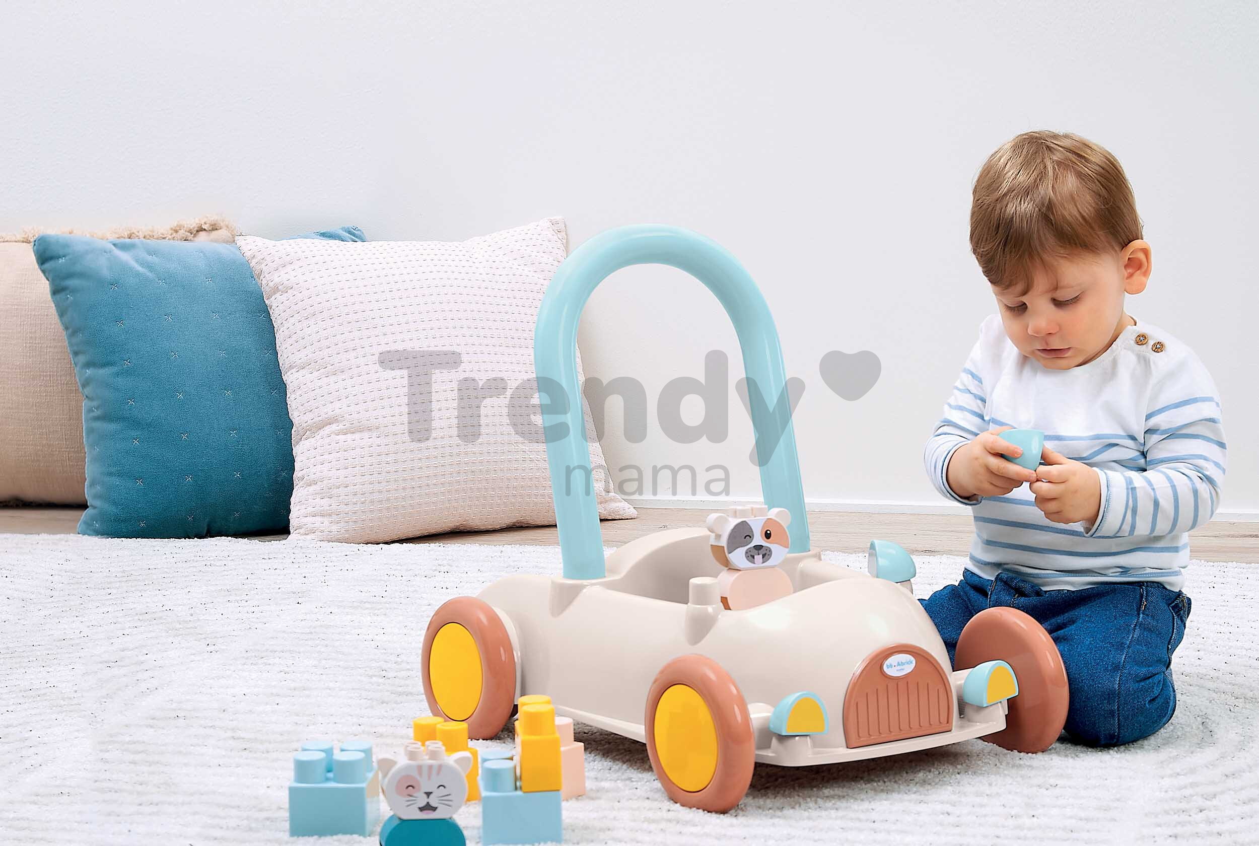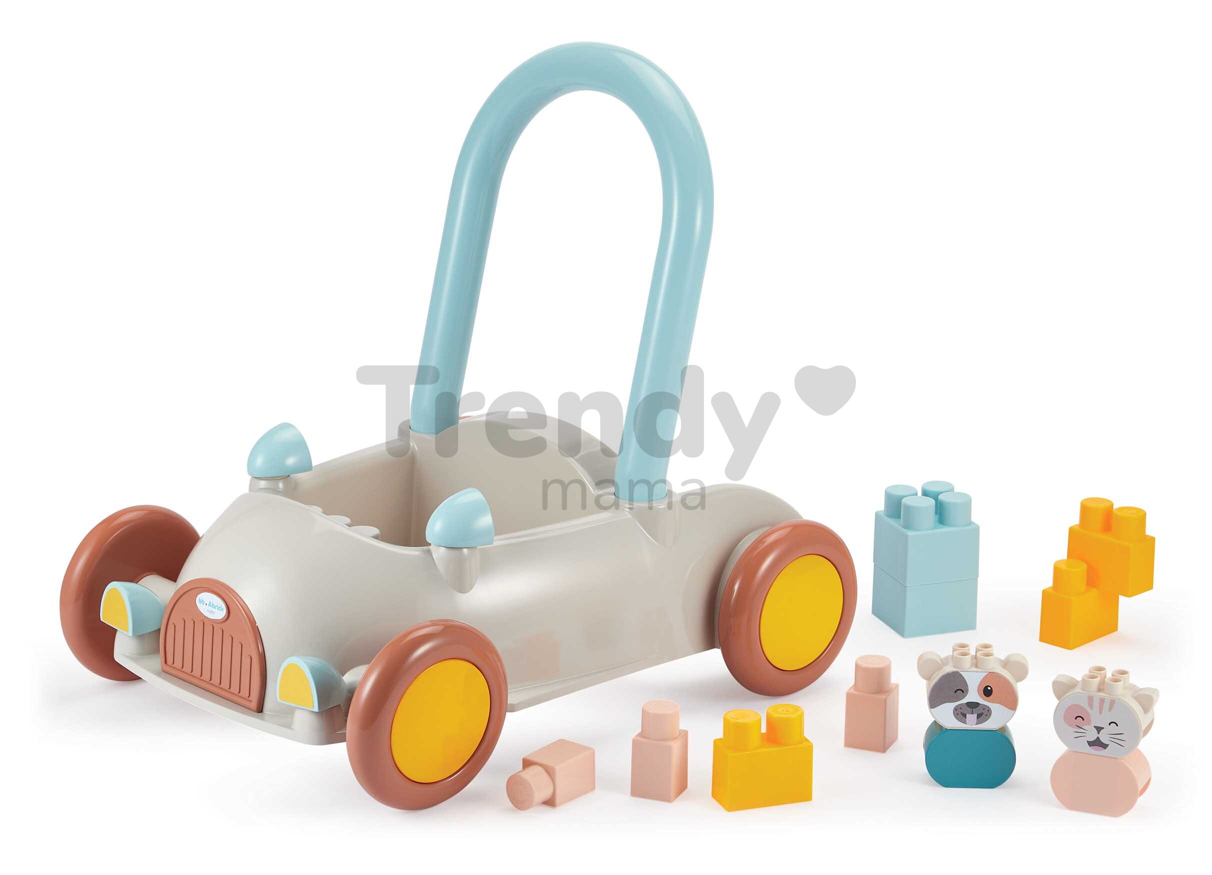 A Baby Walker BB Abrick járássegítő autó a francia Écoiffier gyártótól nagyszerű ajándék minden 12 hónaposnál idősebb gyermek számára. A retro autó formájú járássegítő már első pillantásra elbűvöli a kicsiket, ráadásul egy 16 darabos építőkocka-készlet is tartozik hozzá, amelyeket a gyerekek az autóval szállíthatnak, és bármikor játszhatnak velük. A járássegítő masszív háttámlával van ellátva, amely biztonságot és stabilitást nyújt a gyerekeknek a járás gyakorlása közben. Az autó strapabíró kerekei ideálisak beltéri használatra, alacsony alváza pedig kiváló stabilitást biztosít.
