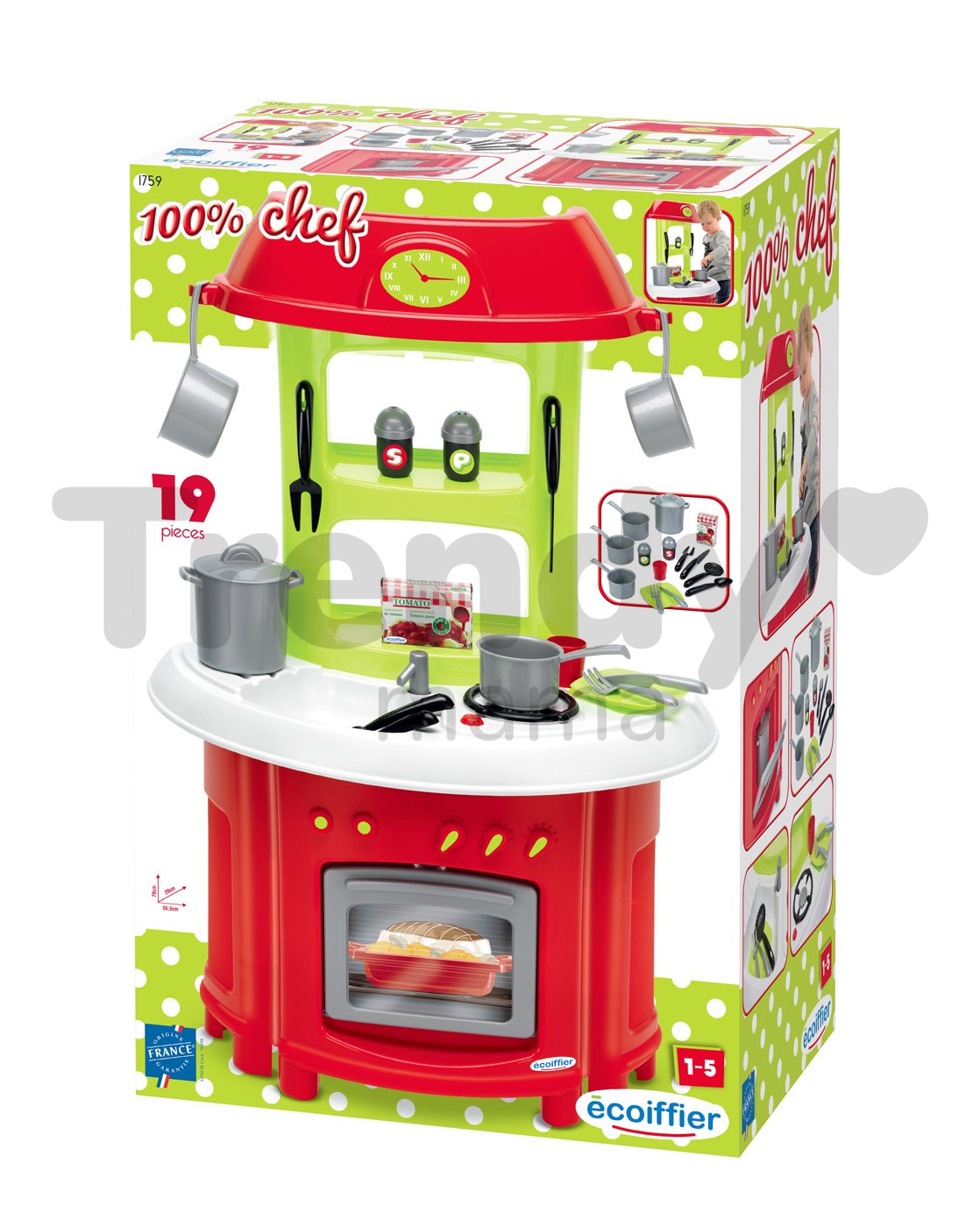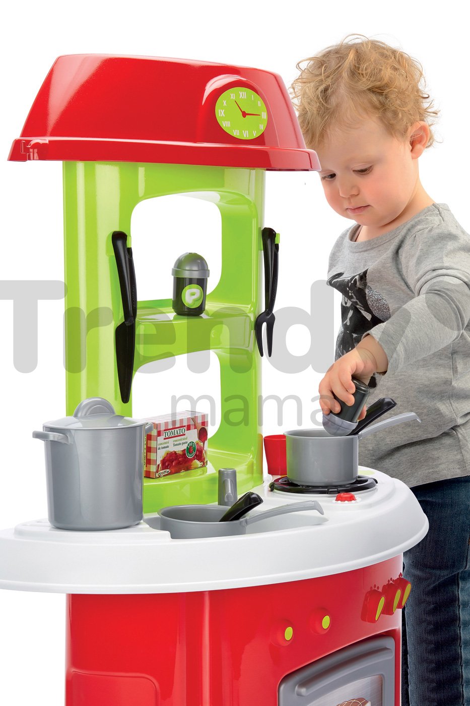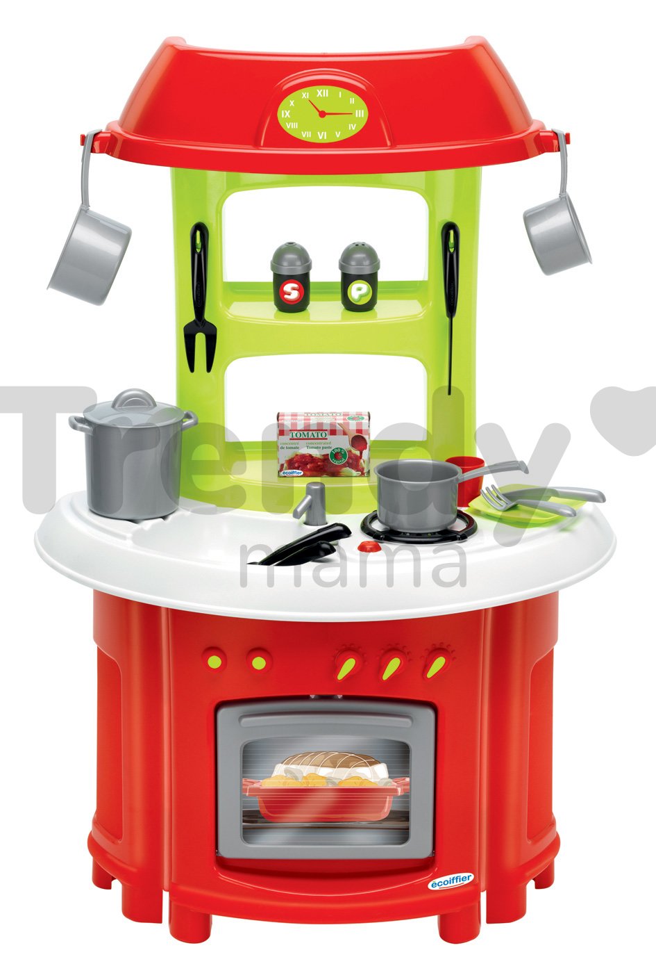 Játékkonyha Tradition a francia Écoiffier vállalat műhelyéből egy modern és csodaszép gyerekkonyha kisfiúk és kislányok számára már 18 hónapos kortól. Konyhácska csodaszép piros, zöld és fehér színkombinációban pompázik, első pillantásra elnyeri a kicsik figyelmét. Teljes magassága 80 cm. A sütő ajtaja lenyitható, illetve mosdótótálca, tűzhely, óra és 19 nagyszerű kiegészítő sem hiányozhat a kis séfszakácsok kiváló konyhácskájából.