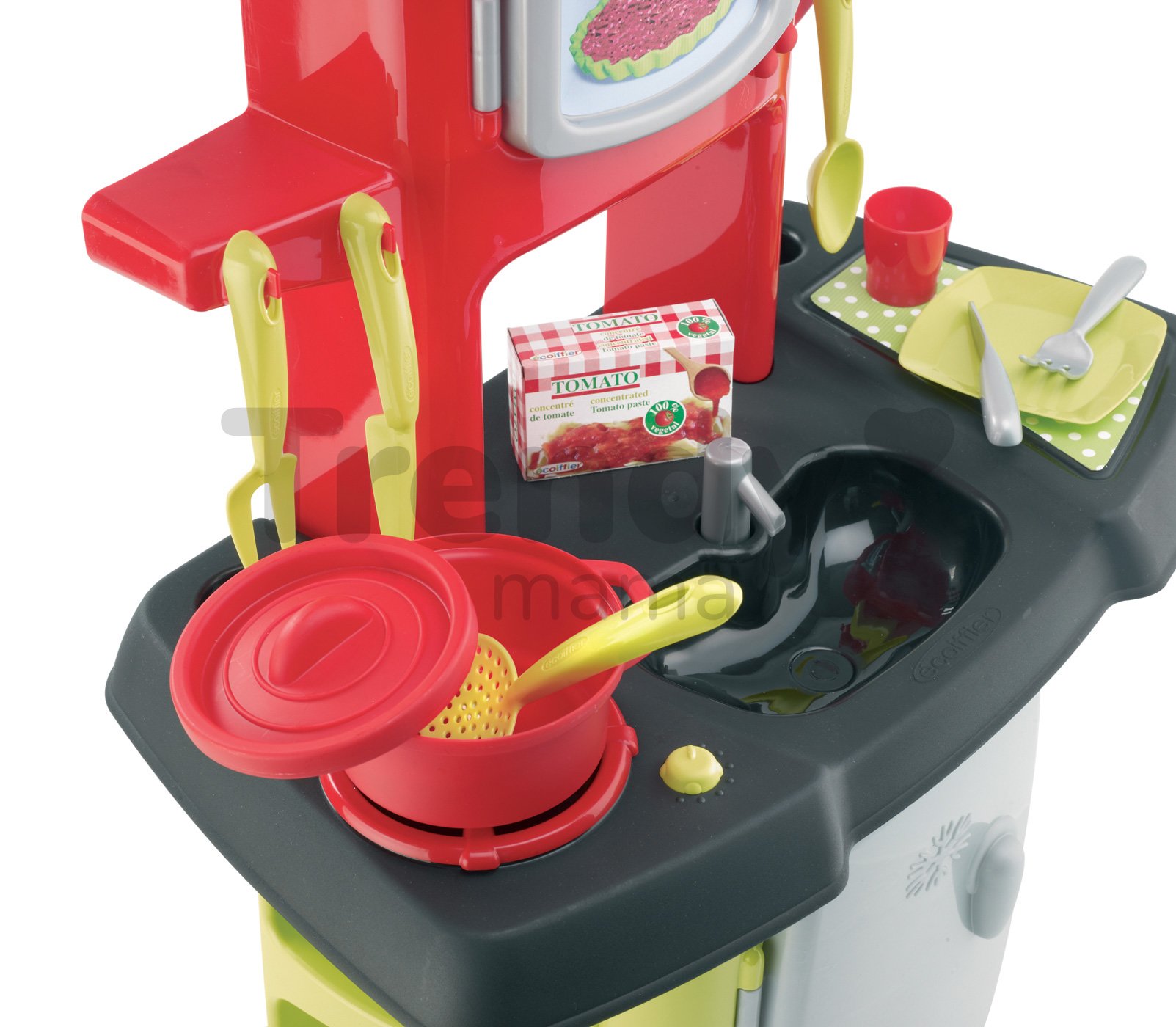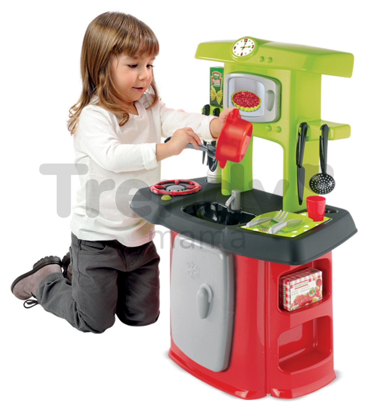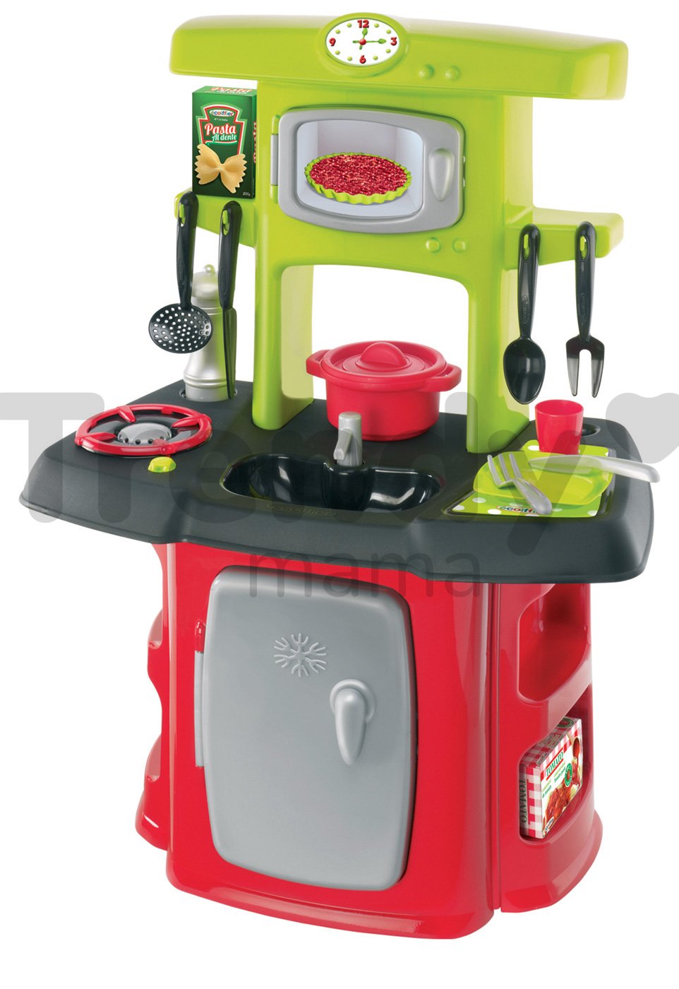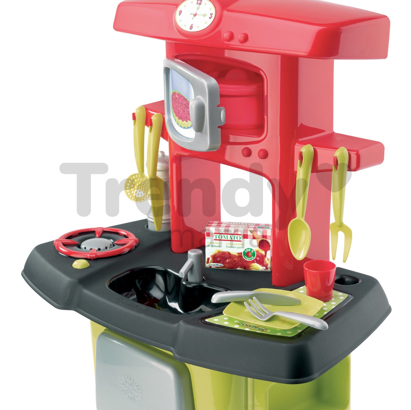 Ez a játékkonyha összesen 14 kiegészítőt tartalmaz, edényeket, lábasokat, élelmiszert, fűszertartót és sokminden mást. Ezek a kiegészítők szórakozás fergetegét kínálják csöppségének. A konyha szép tarka színei minden gyermeket bámulatba ejtenek. Ez mellett a konyha mellett miközben gyermeke a felnőttek világát utánozza, megteheti első lépteit is. Ezzel a konyhával egyszerre több gyerek is kényelmesen játszik. Ez közös játék kibővíti gyermeke szociális viselkedése és kommunikációja skáláját. Ez egy nagyon közkedvelt termék. Dinamikus színkombinációja a top konyhák közé emelte ezt a terméket. A játékkonyha méretei 49*29*67 cm. Ez a konyha gyerekeknek egy minőséges francia termék, mely egy olyan márka gyártmánya, amely a gyerekjáték gyártásban hosszú évekre visszanyúló hagyománnyal büszkélkedhet.