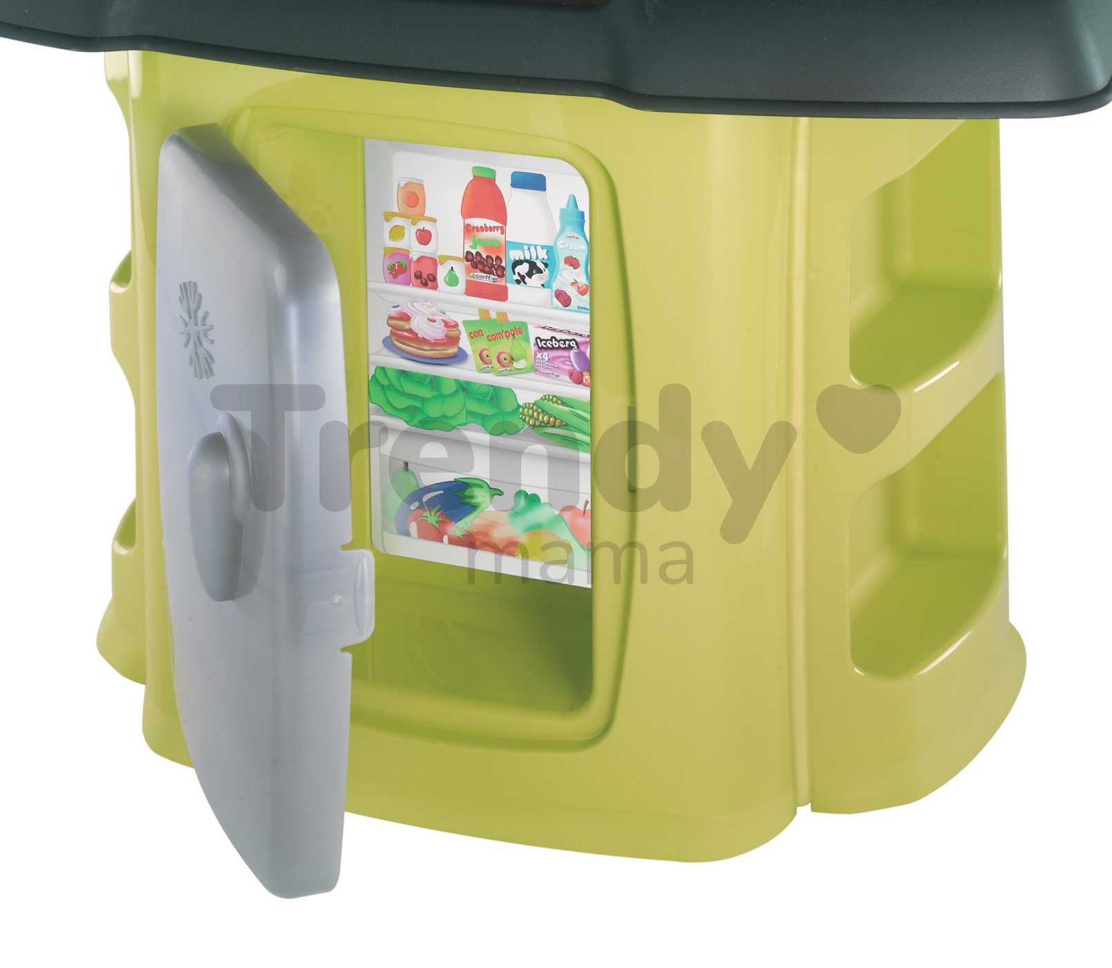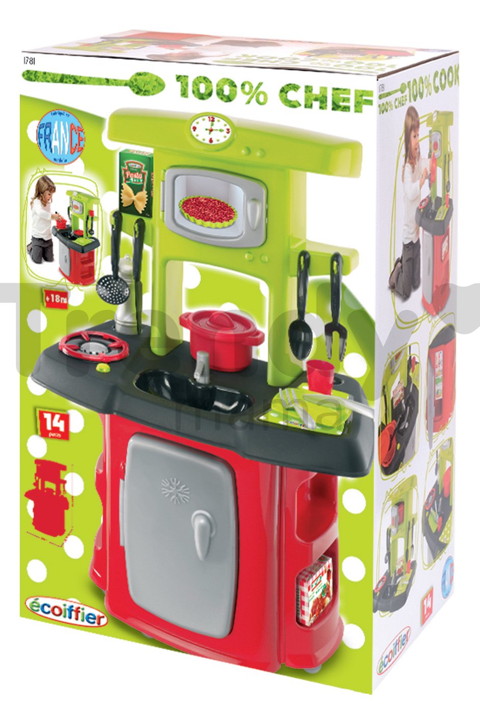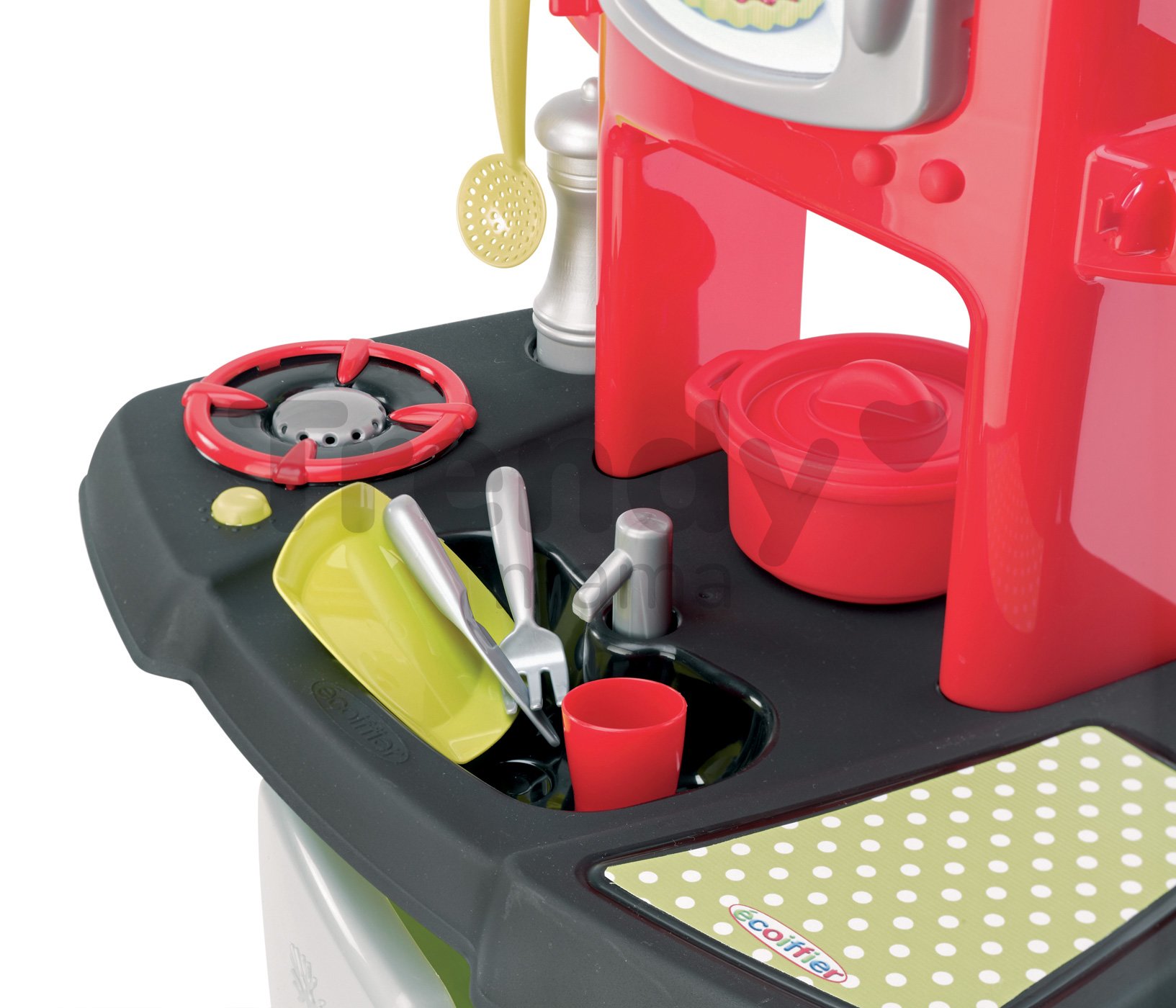 Ez az Écoiffier 100% Chef gyerekkonyha pöttyös 67 cm magas, 49 cm széles konyha gyerekeknek. Szép piros-zöld-ezüst színekben tündököl. Ez a gyerekkonyha gyerekeknek 18 hónapos kortól alkalmas. Nagyon praktikus játékkonyha, minden gyerekszobába tökéletesen beillik. Kinyitható ajtajú hűtővel, szélein edénytartókkal és polcokkal van felszerelve. A tűzhely felett egy órával ellátott szagelszívó található, alatta pedig egy kinyitható ajtajú sütő. Ez a gyerekkonyha egy mosogatótálat és munkaasztalt is tartalmaz. Ez a gyerekkonyha minőséges műanyagból készült.