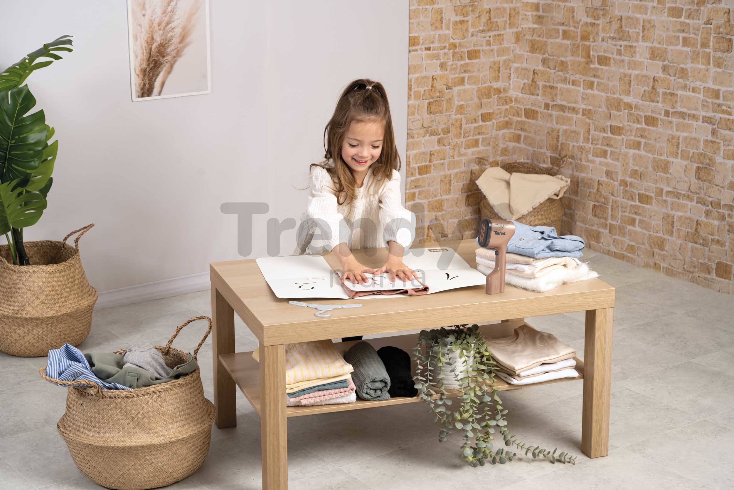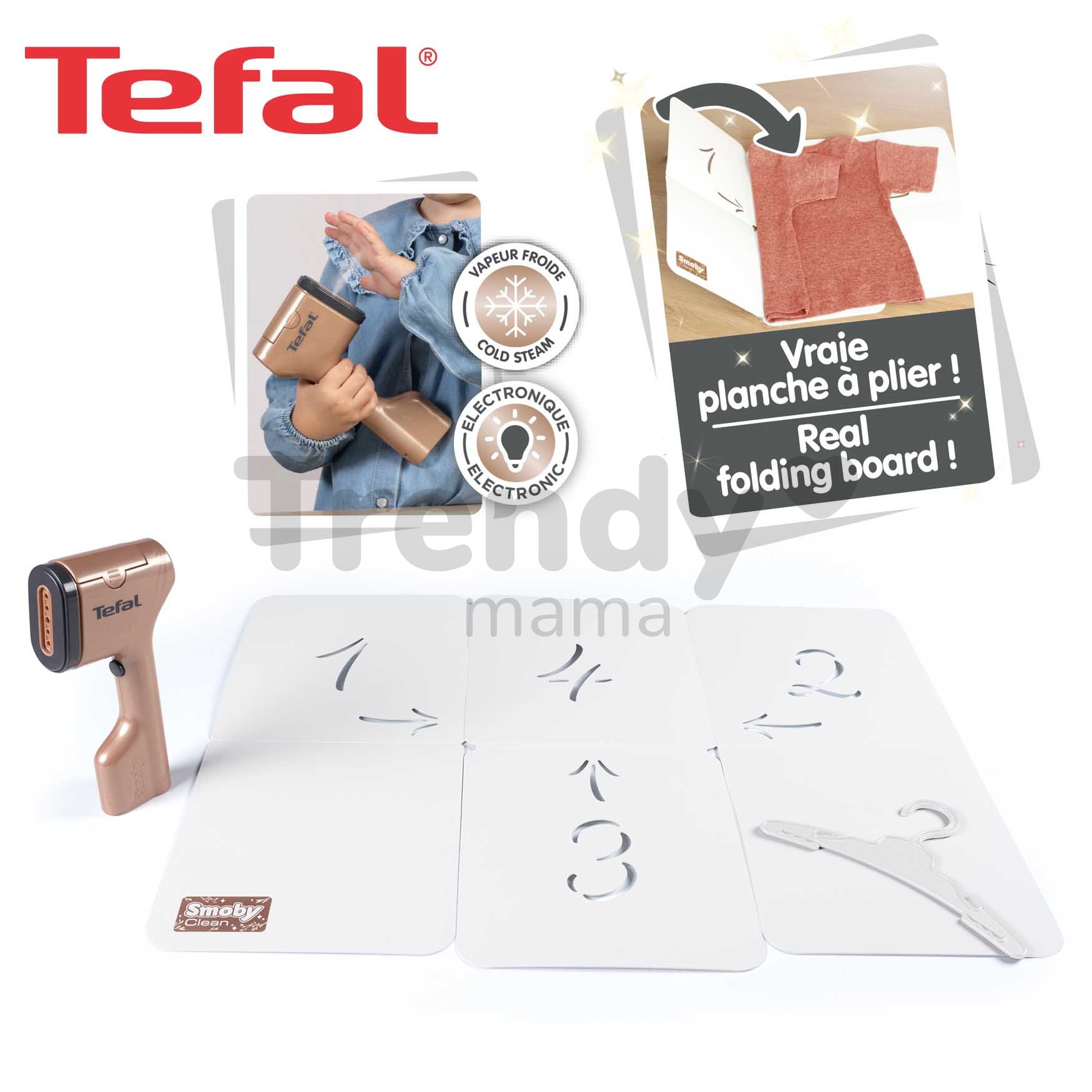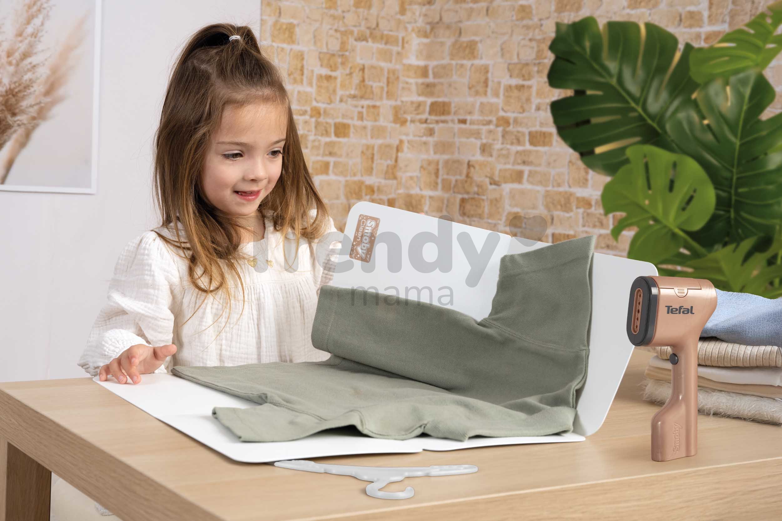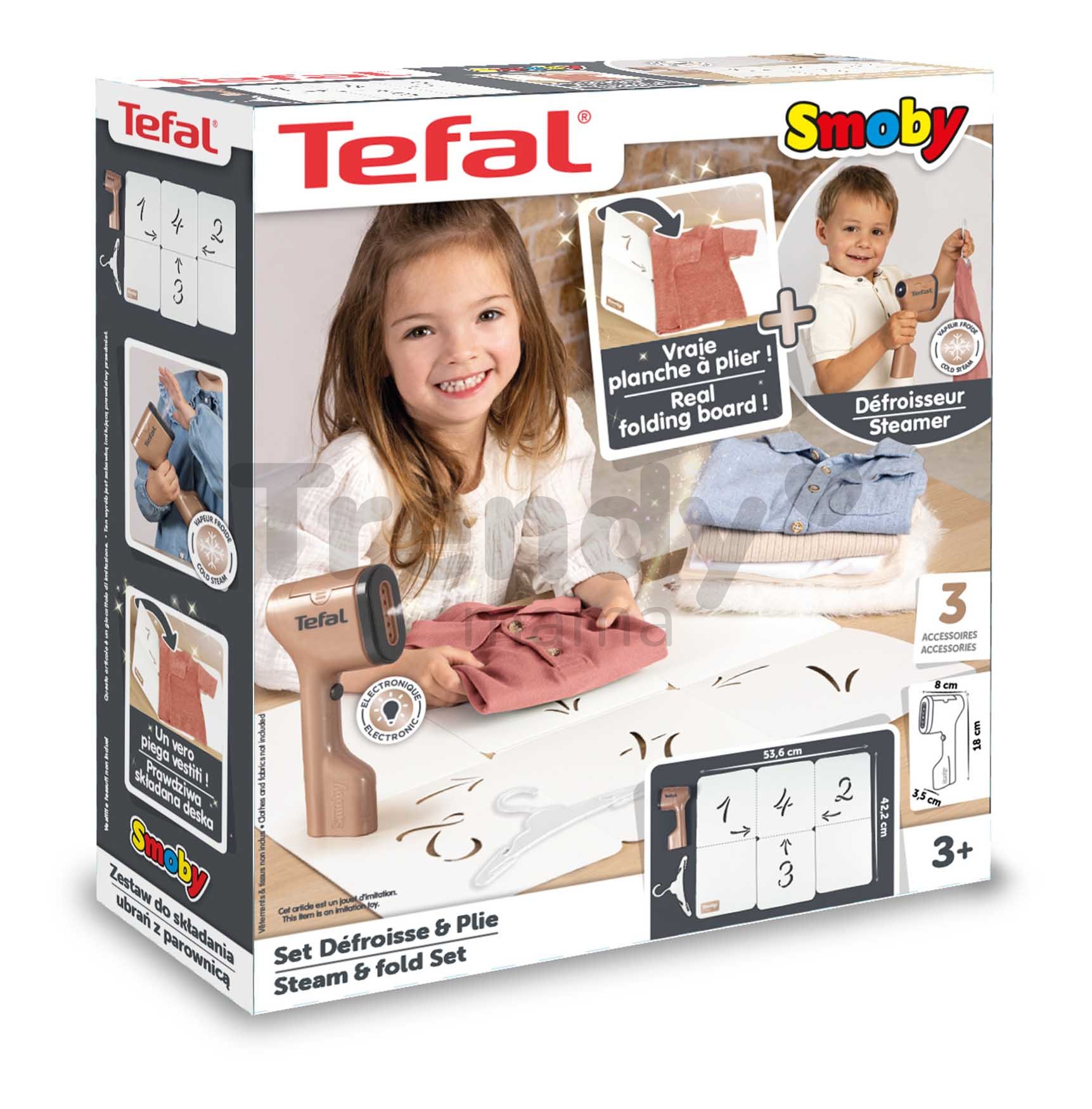 A Tefal Steam&Fold Set kézi ruhagőzölő és ruhahajtogató tábla szett a francia Smoby tervezőitől remek ajándék minden gyermek, különösen a 3 évesnél idősebb kislányok számára. A hajtogatótábla már első pillantásra felkelti a gyerekek figyelmét, praktikus kialakításának köszönhetően pedig könnyen és játékosan megtanulhatják, hogyan kell összehajtani a ruhákat. A tábla részei számozva vannak, ami megkönnyíti a helyes sorrend elsajátítását. Kinyitva a tábla mérete kb. 54 × 43 cm, így a kislányok kényelmesen tudják használni.