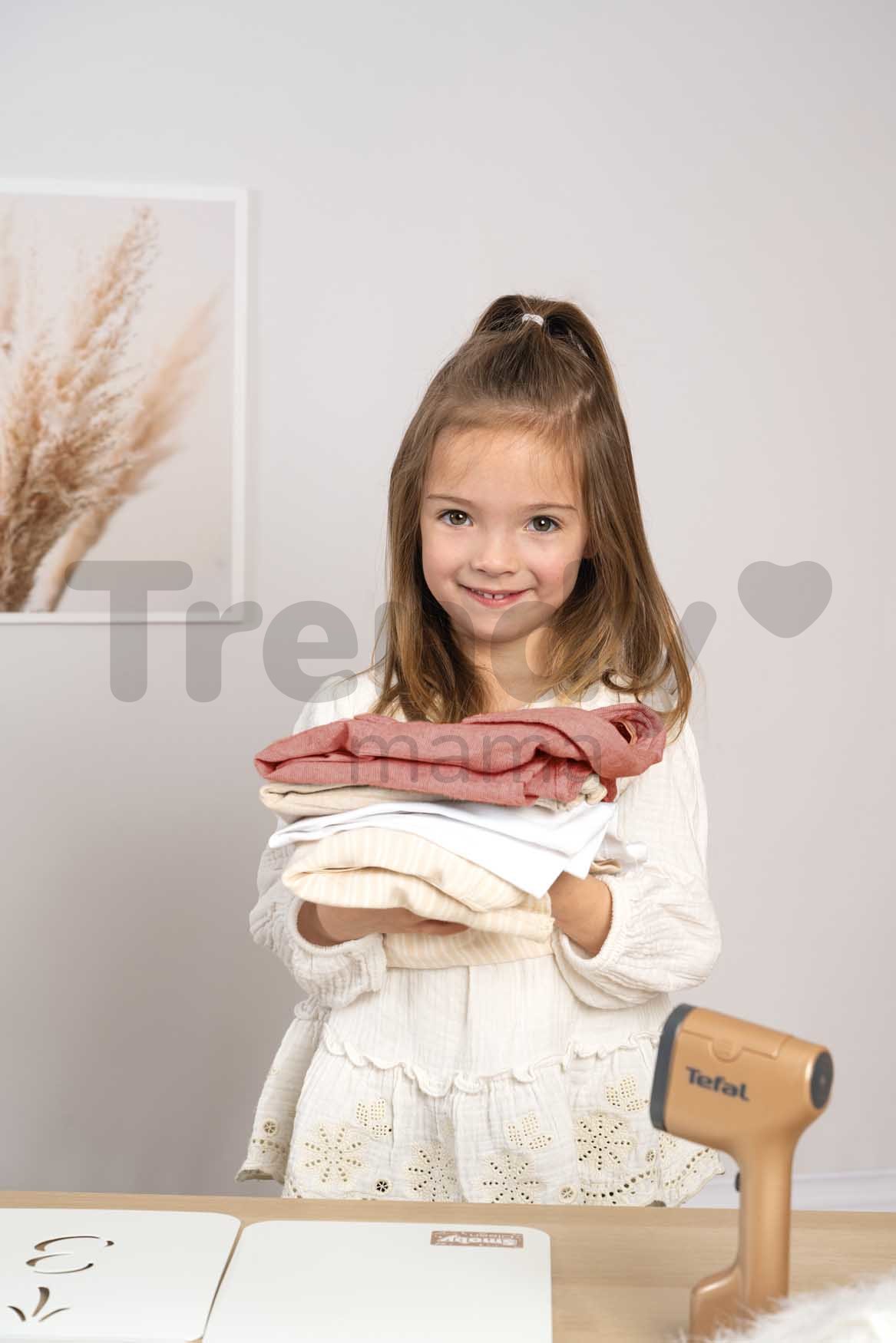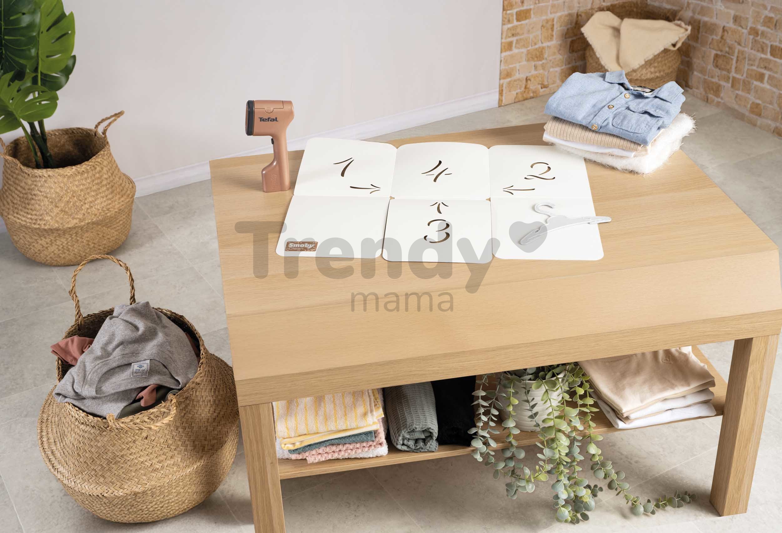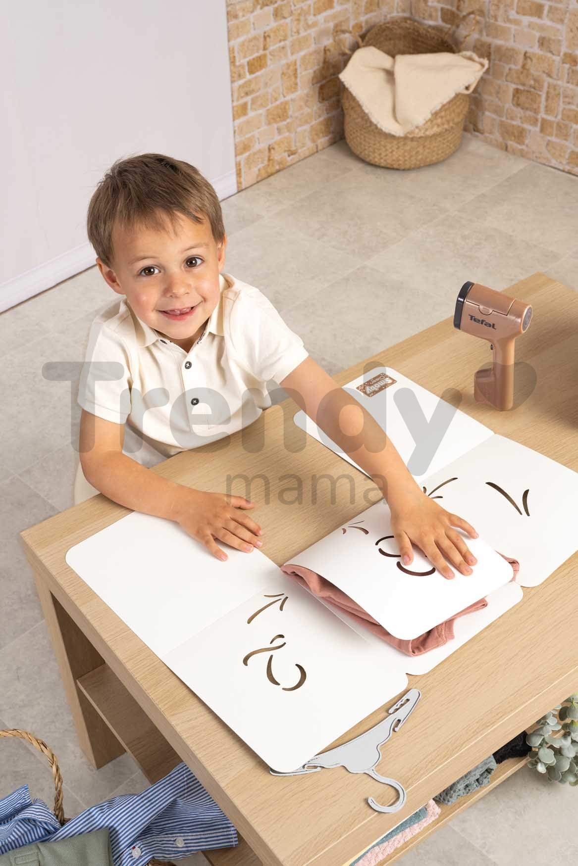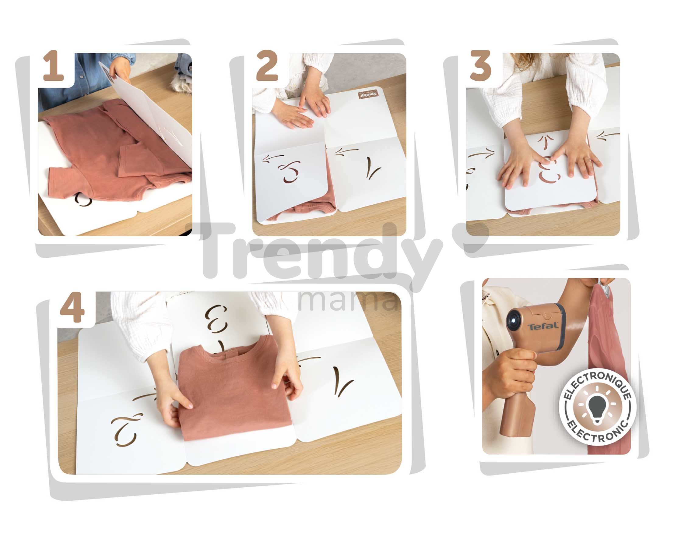 A Tefal Steam&Fold Set kézi ruhagőzölő és ruhahajtogató tábla szett a francia Smoby tervezőitől remek ajándék minden gyermek, különösen a 3 évesnél idősebb kislányok számára. A hajtogatótábla már első pillantásra felkelti a gyerekek figyelmét, praktikus kialakításának köszönhetően pedig könnyen és játékosan megtanulhatják, hogyan kell összehajtani a ruhákat. A tábla részei számozva vannak, ami megkönnyíti a helyes sorrend elsajátítását. Kinyitva a tábla mérete kb. 54 × 43 cm, így a kislányok kényelmesen tudják használni.
