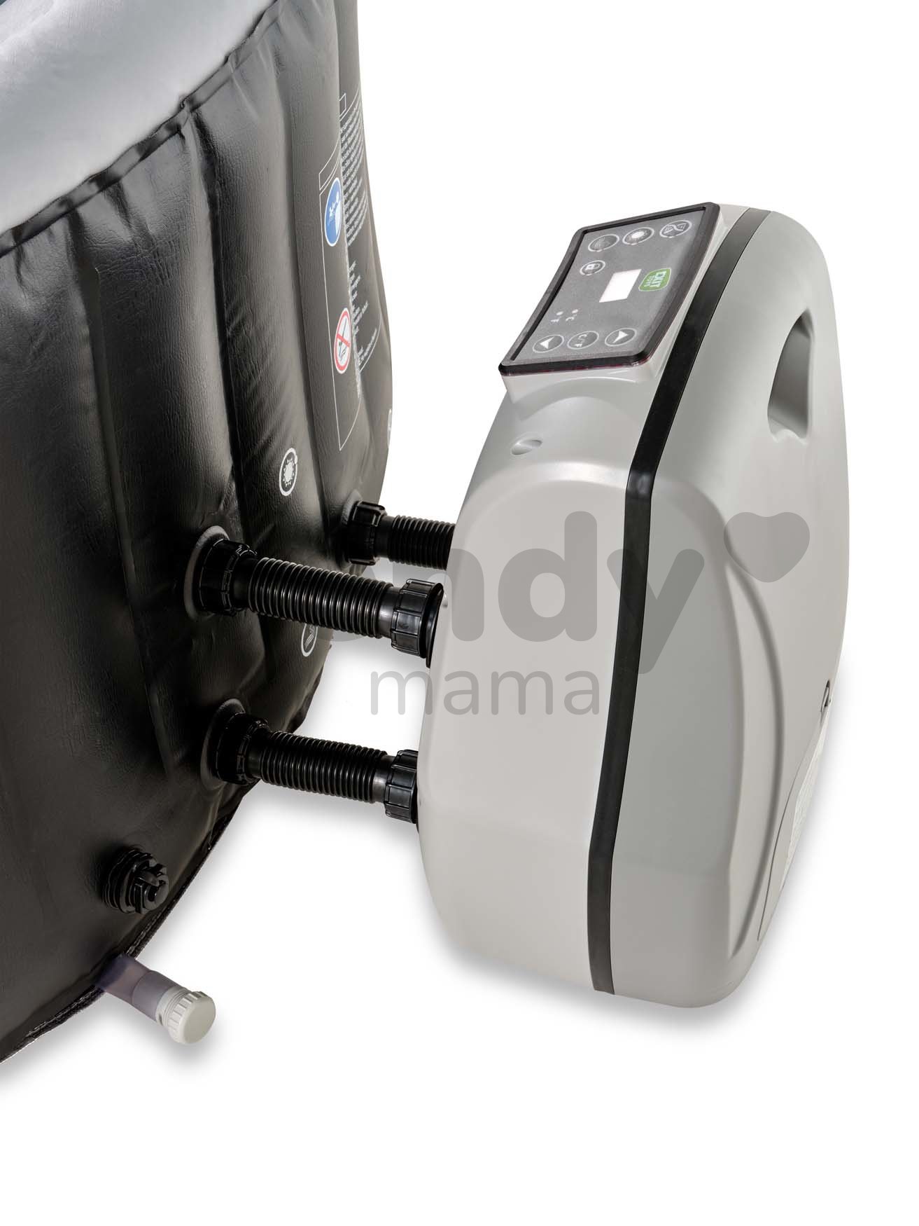 Modern pezsgőfürdő külső fala fekete, belseje pedig szürkés-ezüst színű, így fényűző és időtlen benyomást kelt. A pezsgőfürdő teljes térfogata 1200 liter. A csomag részét képezi egy alátét is a pezsgőfürdő alá, mely megvédi alsó részét, illetve egy izolációs ponyva is, melynek köszönhetően a víz hőmérséklete tovább marad kellemesen meleg. A ponyva klipszes-zárral rögzíthető a pezsgőfürdő felső részéhez. Extra vastag fala 3 rétegű PVC anyagból készült, tartósság és hosszú élettartam jellemzi. Pezsgőfürdő teljes súlya 34 kg, a víz ajánlott mélysége 45 cm.